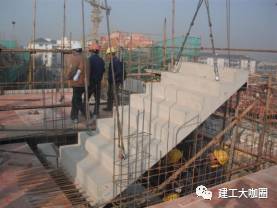 施工前,先搭设楼梯梁(平台板)支撑排架,按施工标高控制高度,并按先梯梁后楼梯(板)的顺序进行。楼梯与梯梁搁置前,应先在楼梯L型支座内铺砂浆,采用软坐灰方式。