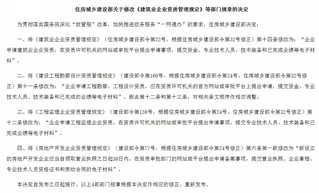 住房城乡建设部日前发布通知称,为贯彻落实国务院深化“放管服”改革,加快推进政务服务“一网通办”的要求,决定对《建筑业企业资质管理规定》等部门规章进行修改。自发布之日起施行。