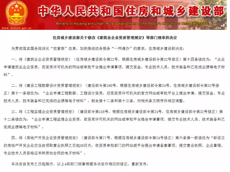 住建部修改4部部门规章,建筑企业资质申请等有新变化!
