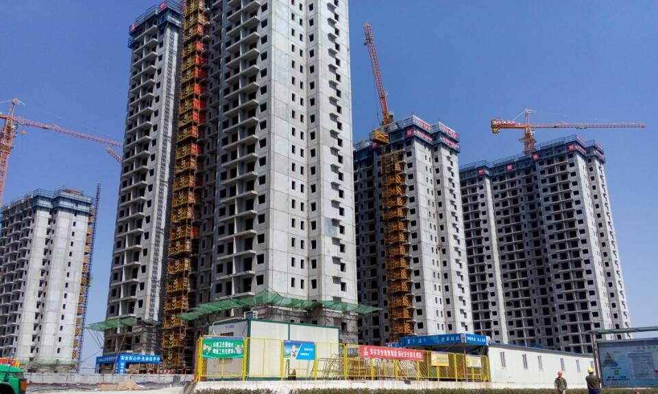 装配整体式剪力墙结构体系采用“预制剪力墙 + 灌浆套筒 + 叠合楼板 + 保温复合构件 + 其他预制墙体 ”的技术方案,具有很好的刚度和整体性,安全可靠,是目前抗震性能最好的结构形式之一。研发出冬期施工早强高强灌浆料,解决了预制剪力墙节点连接施工难题。主楼采用装配式预制结构,双排电动整体爬升架,外爬脚手架直接安装在预制外墙上共同吊装至施工层,一同拼装。这样既节约了时间成本,又降低了高空安装的安全风险。