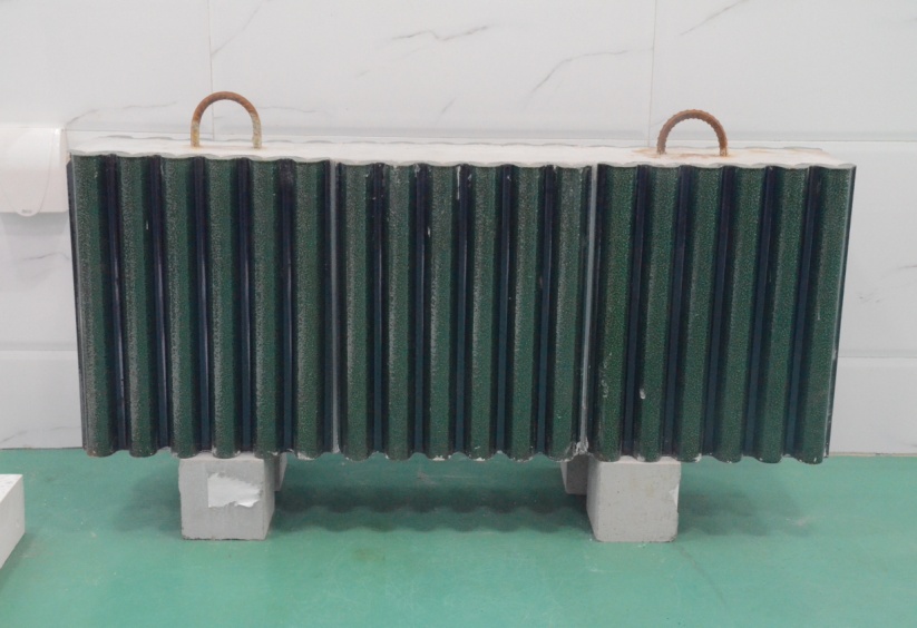 “反打工艺”室外装饰一体化技术是在工厂将外墙装饰面层与混凝土预制墙板整浇成型,即先将装饰材料铺设(喷涂)于模具上,固定后绑扎钢筋浇筑混凝土,使装饰材料和钢筋混凝土预制构件整体结合。采用“反打工艺”技术,避免了后期贴瓷砖工作,瓷砖与混凝土的连接强度更高,有效提高瓷砖平整度以及对缝精准度,生产效率约提高1/3以上。