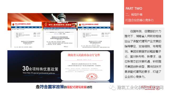 在国务院、住建部的大力推动下,湖南省相继出台了装配式建筑产业发展的指导意见、实施细则、布局规划等文件。湖南东方红建设集团有限公司紧跟国家战略步伐,面对新形势、新要求,适应新常态发展机遇,积极推动集团创新转型,围绕加快发展装配式建筑的要求,打造企业核心竞争力。