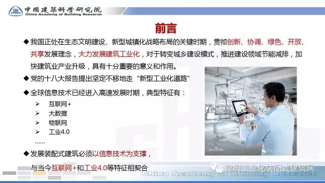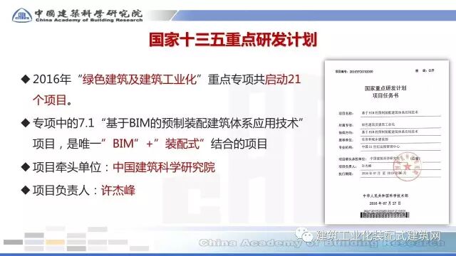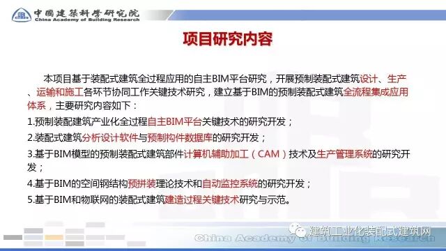 许杰峰副院长指出,大力发展装配式建筑与信息技术应用已上升成为推动建筑业转型升级的国家战略。装配式建筑以设计标准化、生产工厂化、施工装配化、装修一体化、管理信息化和应用智能化的“六化”为基本特征,其中“管理信息化”为装配式建筑全过程应用提供信息技术支撑,而BIM是信息技术在建筑行业的最佳应用。BIM技术支撑装配式建筑全过程应用,并推动推建筑产业实现现代化发展。许杰峰副院长牵头的“基于BIM的预制装配建筑体系应用技术”项目,是2016年度国家“十三五”重点研发计划“绿色建筑与建筑工业化”专项21个项目中,唯一一个“BIM”与“装配式”结合的项目,该项目的研发成果将支撑装配式建筑全过程、全专业协同应用。