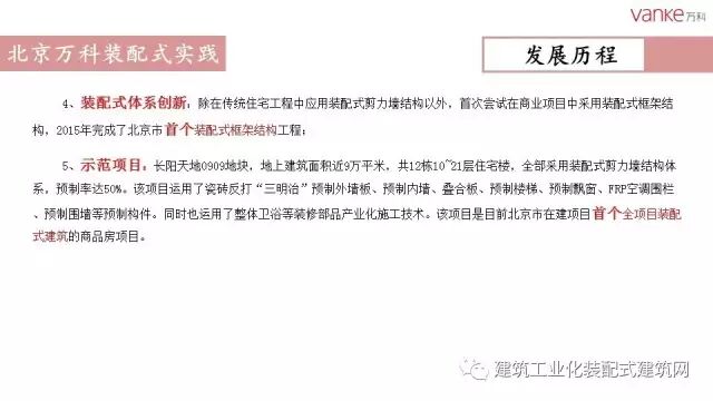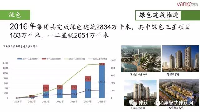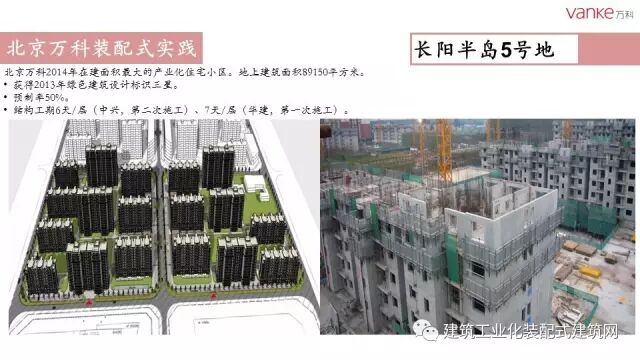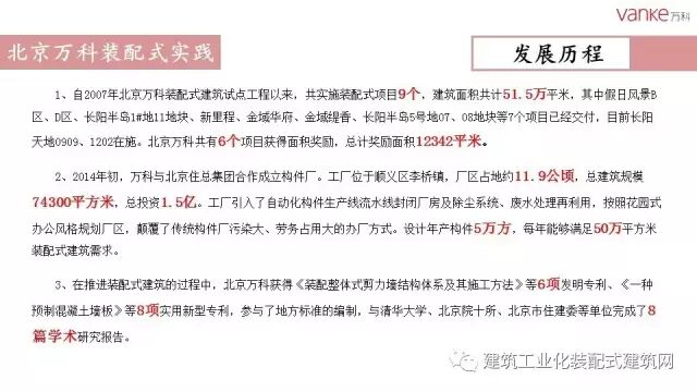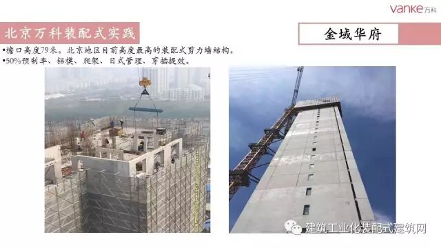 任光洁总工指出,自2007年北京万科开展装配式建筑试点工程以来,共实施装配式项目9个,建筑面积51.5万平米。作为北京市在建项目中首个全项目装配式建筑的商品房项目,万科长阳天地0909地块全部采用装配式剪力墙结构体系,预制率达50%,采用瓷砖反打“三明治”预制外墙板、预制内墙、叠合板、预制楼梯、预制飘窗、FRP空调围栏、预制围墙等预制构件。同时也运用了整体卫浴等装修部品产业化技术。2014年,万科与北京住总集团合作成立构件厂,设计年产构件5万方,每年能够满足50万平方米装配式建筑需求。万科在绿色建筑和装配式建筑方面将不断探索,更进一步。